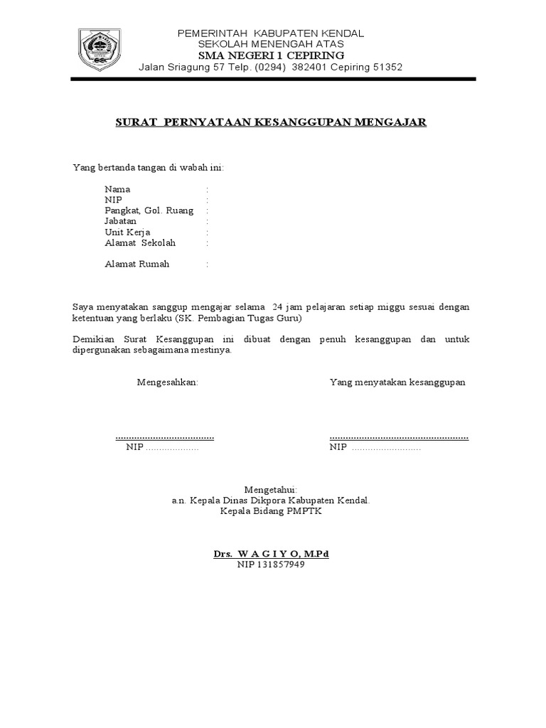 Saya rasa lengkap sudah pembahasan kita kali,dari mulai tips dan contoh surat pernyataan kesanggupan diri sudah saya informasikan kepada anda.selamat. Surat ini bisa diartikan sebagai jenis surat yang isinya menyatakan kesanggupan dan kemampuan dalam menjalankan suatu aturan, tugas dan atau. Demikian surat tugas ini diberikan untuk dapat dilaksanakan dan dimohon untuk menyertakan laporan secara tertulis terkait kegiatan yang telah. Semoga dapat menjadi manfaat bahan referensi bagi kita semua dalam. Contoh surat pernyataan kesanggupan menaati peraturan.
